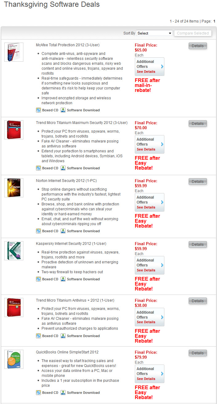 It's Thanksgiving season, and well-known office supply chain Staples is giving away free (after rebate) major software titles like Kaspersky Internet Security 2012, Norton Internet Security 2012, McAfee Total Protection 2012 (3-User), Trend Micro Titanium Maximum Security 2012 (3-User), Trend Micro Titanium Antivirus + 2012 (1-User), QuickBooks Online SimpleStart 2012 to celebrate the occasion for a limited period.