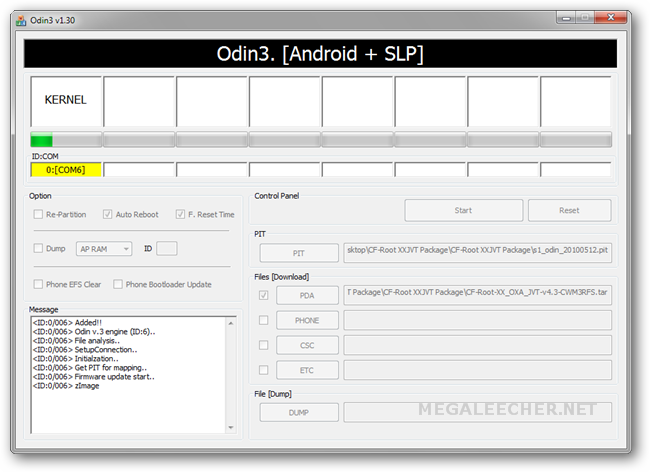 - Now click the "PIT" button and browse for file "s1_odin_20100512.pit" from the downloaded package, similarly click "PDA" button and browse for "CF-Root-XX_OXA_JVT-v4.3-CWM3RFS.tar" file. Make sure "Re-Partition" is unchecked and "Auto Reboot" and "F.Reset Time" are both checked, click "Start" button to initiate the process.